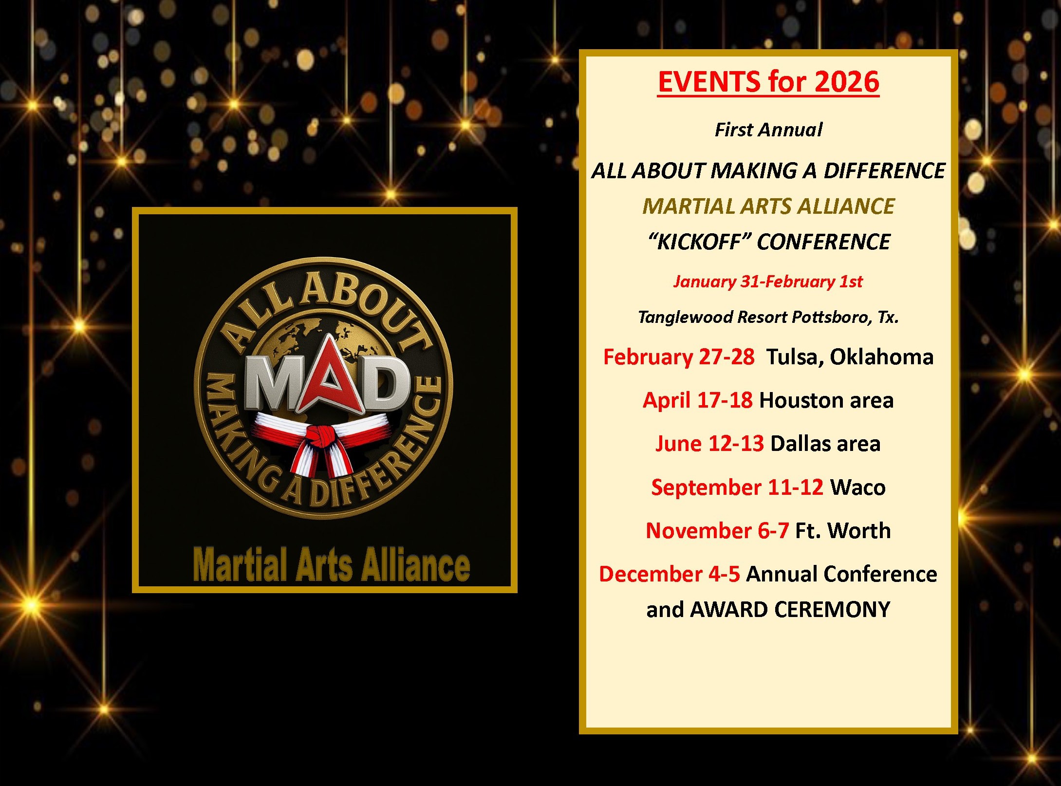 MAD is a nonprofit alliance of martial artists, schools, and supporters untied to make a difference through action and participation. We host leadership certifications, tournaments, and events - all to fund relief for veterans ands struggling school owners.